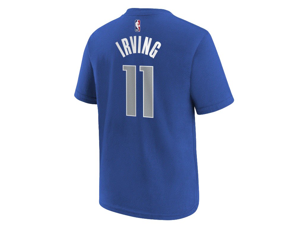 Dětské volnočasové tričko značky Nike z kolekce NBA s motivem týmu Dallas Mavericks hráč Kyrie Irving.